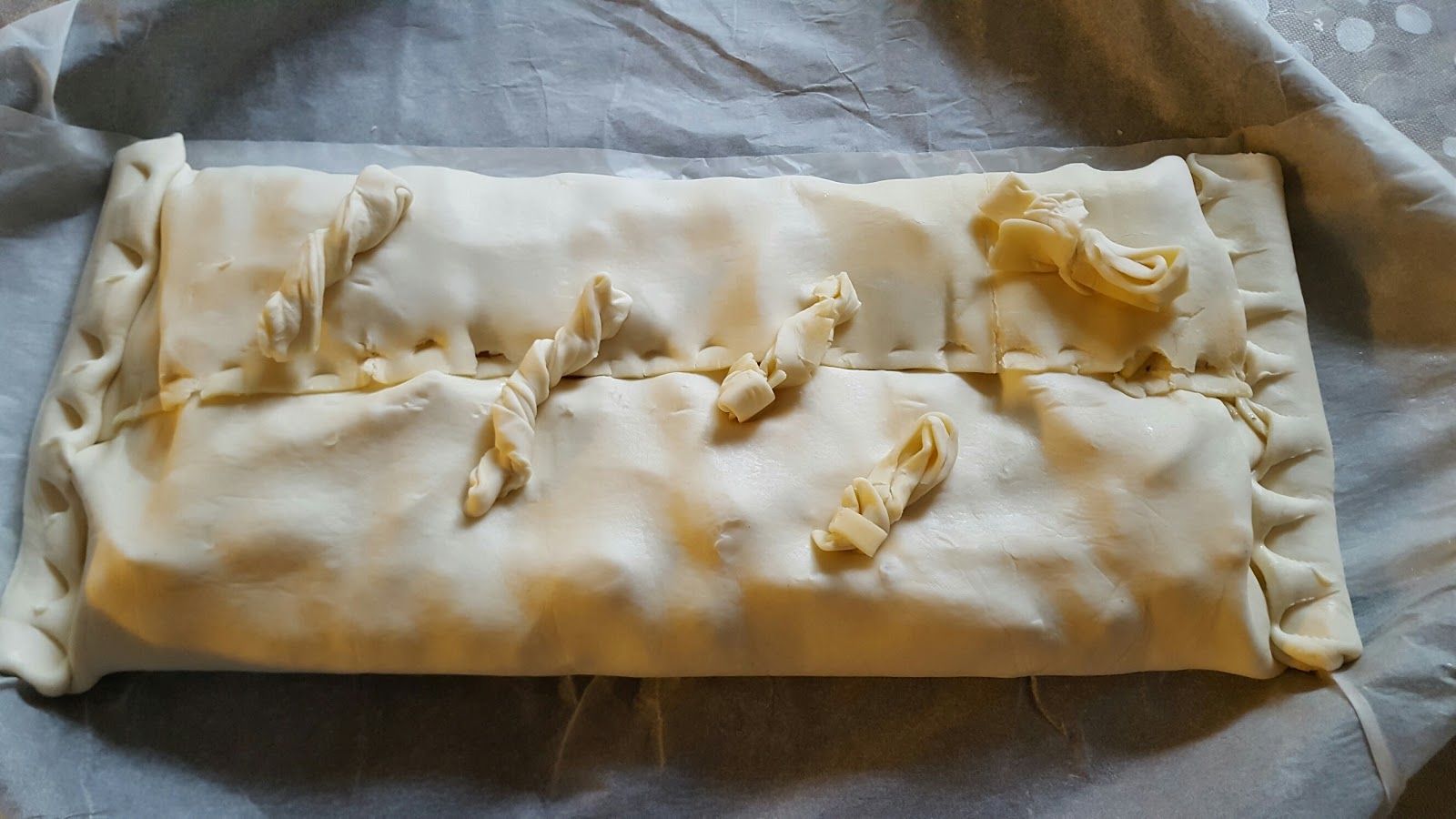 Richiudere lo strudel unendo i lembi laterali e sigillare anche i lati. Se vi avanza un pò di pasta sfoglia potete fare qualche decorazione.