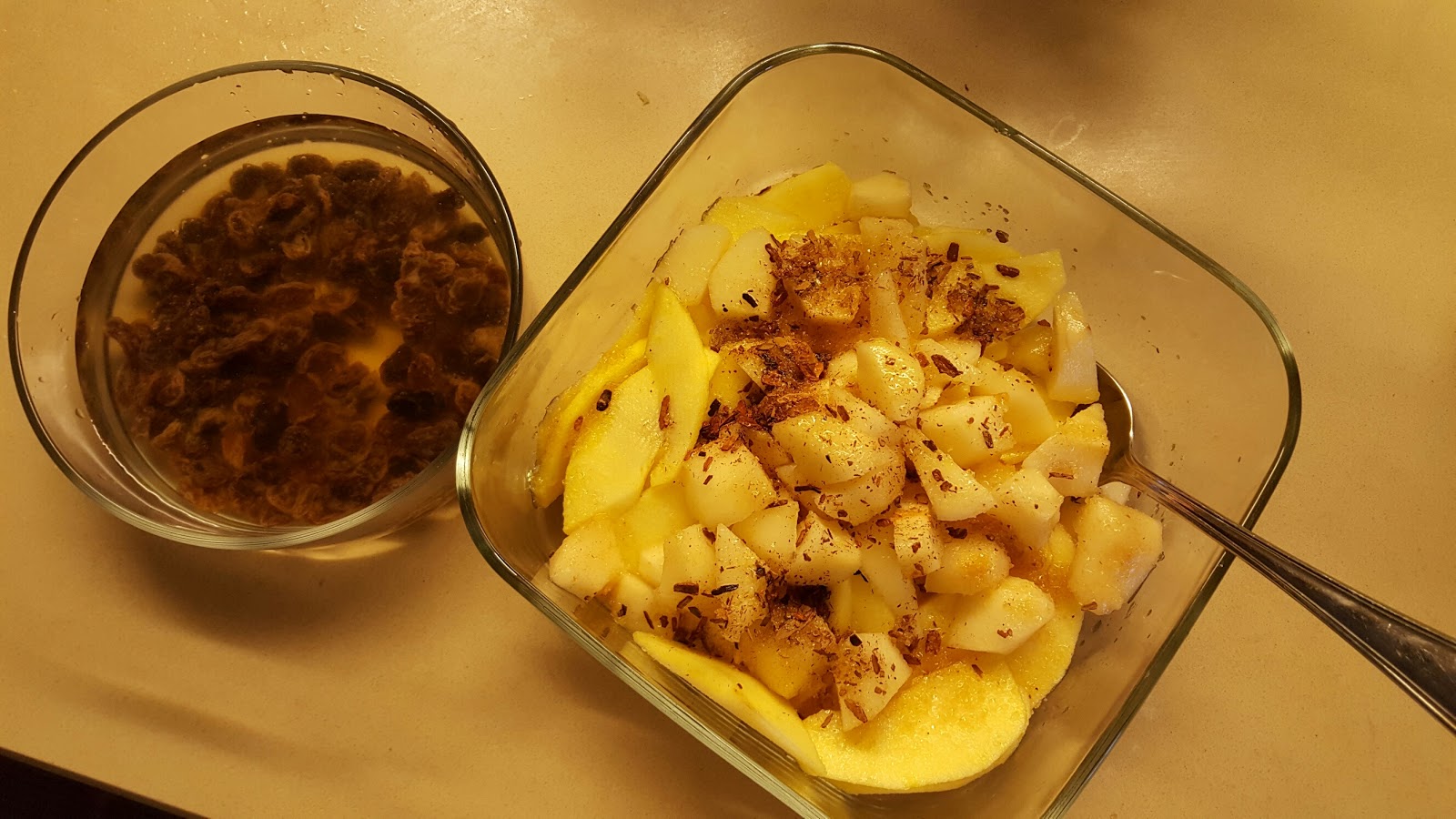 Per iniziare, mettiamo in ammollo l’uvetta; sbucciamo e tagliamo a fettine sottilissime le mele e le pere e in una ciotola, veriamoci sopra il succo di limone, lo zucchero di canna e la cannella e facciamole riposare.
