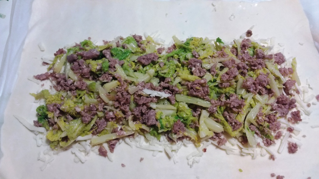 - Cospargere con l’Asiago la parte centrale, nel senso della lunghezza, per isolarla dall’umidità che potrebbe rilasciare la verza, poi disporvi sopra metà della salsiccia ed infine la verza stessa quanta ne basta. Terminare con il resto della salsiccia e del formaggio.