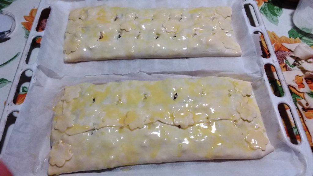 - poi chiudere le parti laterali saldandole tra loro con una pennellata di uovo sbattuto insieme a poca panna o latte. Spennellare con questo mix anche tutta la superficie dello strudel, fare dei taglietti con le forbici a distanza regolare per lo sfiato del vapore che si formerà in cottura e, se avanzano dei ritagli, ci si può divertire a fare delle piccole decorazioni a fantasia.