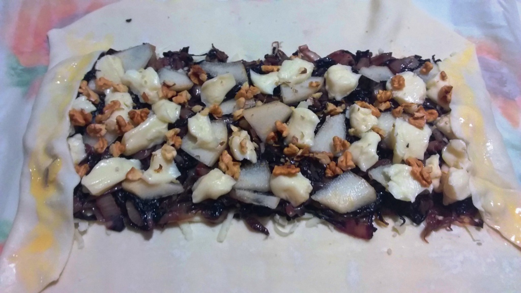 - Cospargere con l’Asiago la parte centrale, nel senso della lunghezza, per isolarla dall’umidità che potrebbe rilasciare la farcia, poi disporvi sopra il radicchio stufato, il taleggio a pezzetti, le fettine di pera e le noci sbriciolate. Risvoltare i bordi corti sopra il ripieno.