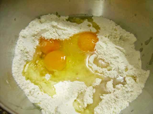 Disporre la farina a fontana sul piano di lavoro, unire lo zucchero e il pizzico di sale, al centro mettere le uova e l’olio;