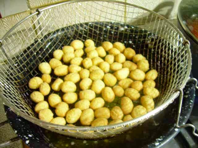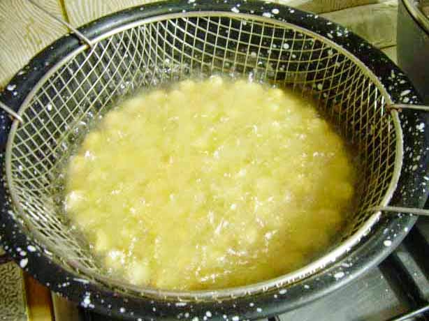 In una padella dai bordi alti versare l’olio di semi e quando l’olio sarà bollente, calare gli struffoli.
