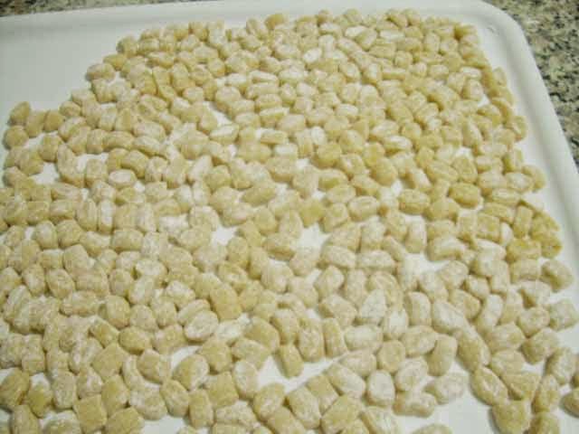 Formare con l’impasto dei cordoncini di pasta e tagliarli a pezzettini piccoli.