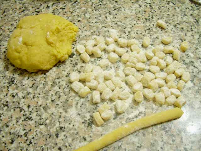 Formare con l’impasto dei cordoncini di pasta e tagliarli a pezzettini piccoli.