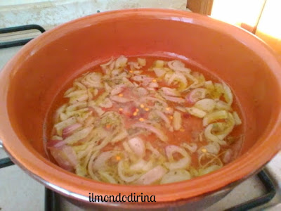 Affettate la cipolla e fatela rosolare in abbondante olio evo, unite dell’origano, il peperoncino secco e lo stocco.