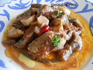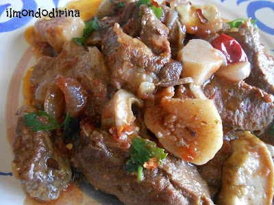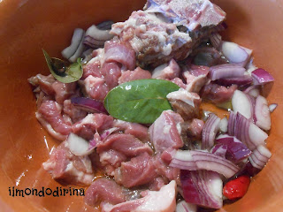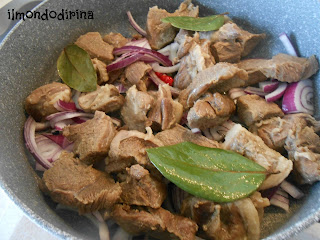 Marinate la carne in acqua e aceto per 24 ore, rigirandola di tanto in tanto. Tagliatela a tocchetti, asciugatela e fatela rosolare a fuoco vivo in una pentola con l’olio, la cipolla, l’aglio, l’alloro e il peperoncino.