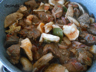 Aggiungete quindi un bicchiere di vino rosso, fatelo evaporare e poi aggiungete i pomodori tagliati a pezzetti. Aggiustate di sale, aggiungete un bicchiere di acqua e continuate la cottura a fuoco dolce per due ore circa, fintanto che la carne non sarà morbida.
