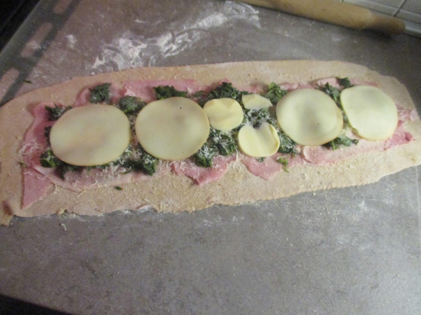 Trascorse le 2 ore, infarinate bene la spianatoia e stendete l’impasto con il mattarello, abbastanza sottile (vedi foto). Riempitelo con gli ingredienti del ripieno e spolverate con il pangrattato. Richiudete il rotolo e unite i 2 estremi. Cuocete a 240 gradi per circa 20 / 25 minuti. A cottura ottenuta, fate raffreddare, tagliate e servite.
