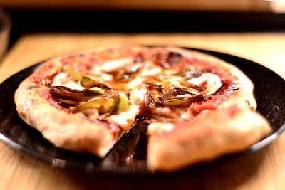 Preparate quindi la pizza: scaldate sul fuoco una padella a fondo spesso. Con movimenti circolari, allargate il panetto di impasto ben lievitato e fatelo cuocere nella padella. Conditelo con la salsa e la mozzarella, continuate la cottura per tre minuti. Togliete quindi la pizza dalla padella e mettetela sotto il grill del forno finché ben cotta. Conditela coi carciofi e con la salsa al balsamico.