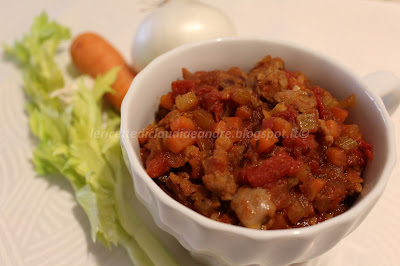 Lavare la carota e il sedano, sbucciare la cipolla e gli spicchi d’aglio e tagliare il tutto a cubetti. Fare un soffritto con le verdure, aggiungendo anche il peperoncino tagliato a rondelle, se piace e cuocere per 2 minuti in 2 cucchiai di olio. Aggiungere la salsiccia sgranata, rosolare, sfumare con il vino e lasciare evaporare. Unire la polpa di pomodoro, un bel bicchiere di acqua, insaporire con pepe e con brodo vegetale granulare, io non posso fare a meno del mio brodo fatto in casa, ma in mancanza usate pure del sale o quello che usate solitamente per insaporire. Coprire e cuocere a fuoco moderato per circa 30 minuti, mescolando ogni tanto. Una volta pronto, condire una pasta a piacere, per noi spaghetti, del riso, buono anche con una purea di patate, con del cous cous, … o come più si desidera, comunque sia è molto saporito e buono !