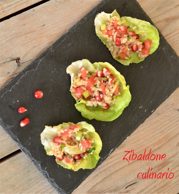 Tagliare i pomodori e il cipollotto, unire i semi di melagrana e prezzemolo, aggiungere il grano bulgur, aromatizzare con cannella.