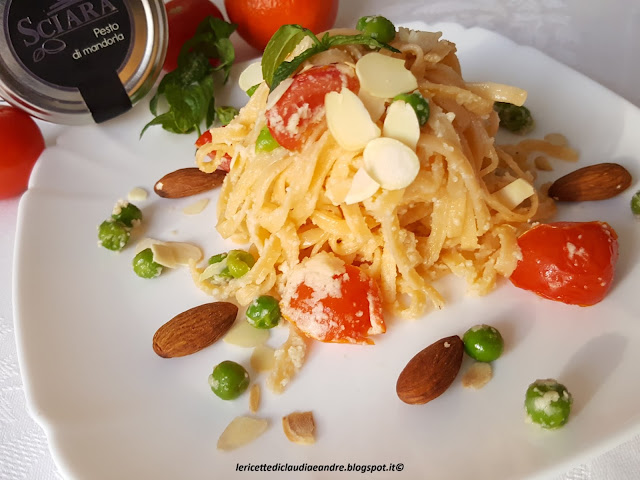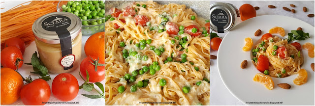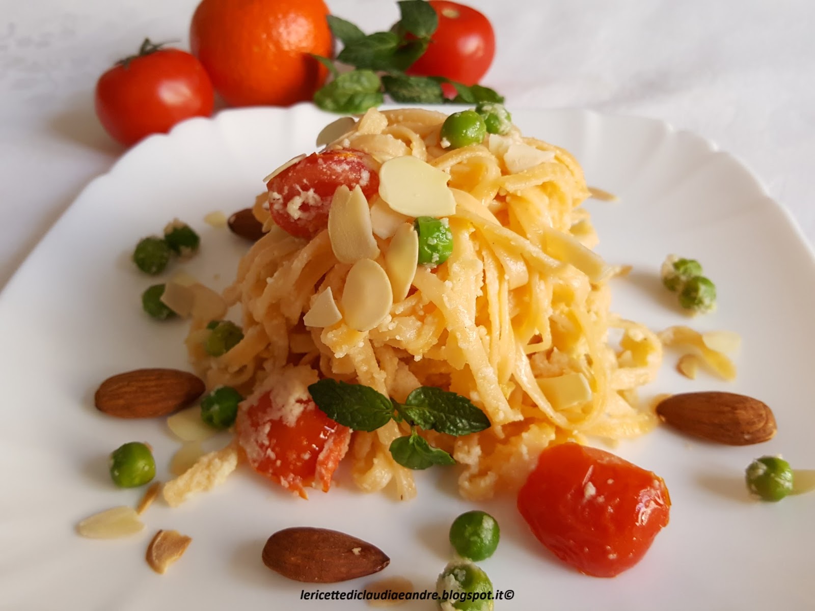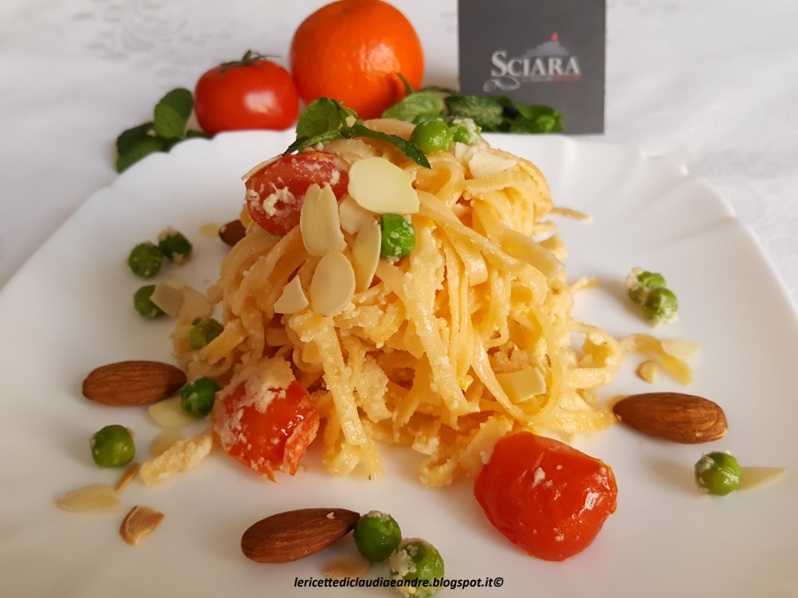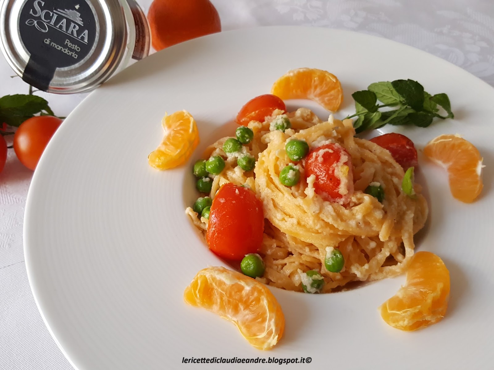 Tagliatelle agli agrumi con pesto di mandorla, piselli, pomodorini e profumo di menta