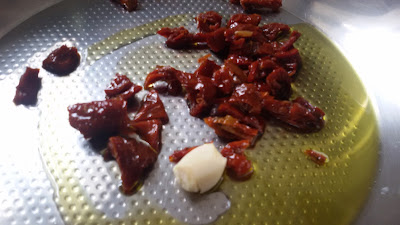 Mettere in una padella l’olio, l’aglio schiacciato e i pomodorini ben strizzati