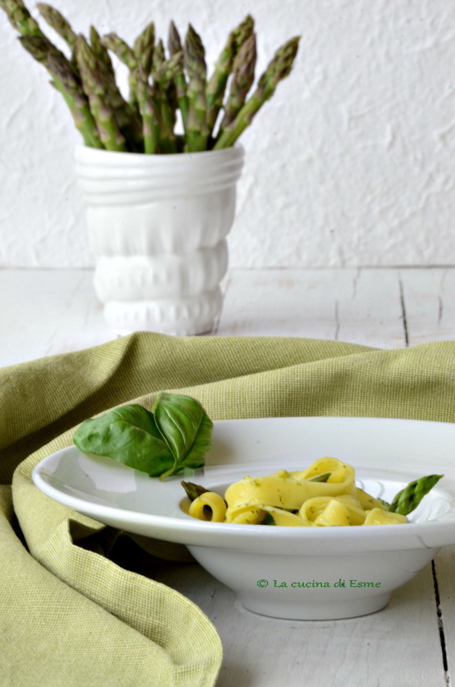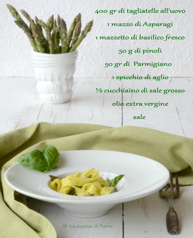 Lavate gli asparagi sotto l’acqua corrente, eliminate la parte finale più dura, pareggiateli e pelate il gambo con un pela patate. Tagliate le punte che serviranno intere e riducete i gambi a rondelle. In un mixer inserite le rondelle dei gambi degli asparagi, lo spicchio di aglio a fettine, le foglie di basilico fresco ben lavate ed asciugate, il sale grosso, i pinoli, un paio di cucchiai di olio e frullate fino a che il composto non diverrà ben cremoso (potrebbe servire altro olio, nel caso aggiungetelo a filo) in ultimo unite il parmigiano e frullate ancora fino a rendere la salsa omogenea. Tenete da parte il pesto e passate alla cottura degli asparagi. In una padella fate sciogliere a fuoco bassissimo pochissimo burro e fate saltare le punte di asparagi intere per 5 minuti, salate e spegnete il fuoco. Portate a bollore l’acqua per la pasta, versate le tagliatelle e lasciatele cuocere per il tempo necessario. Quando la pasta sarà al dente, scolatela e trasferitela nella ciotola da portata dove avrete precedentemente messo il pesto preparato, amalgamate bene poi aggiungete le punte di asparagi, mescolate e servite.
