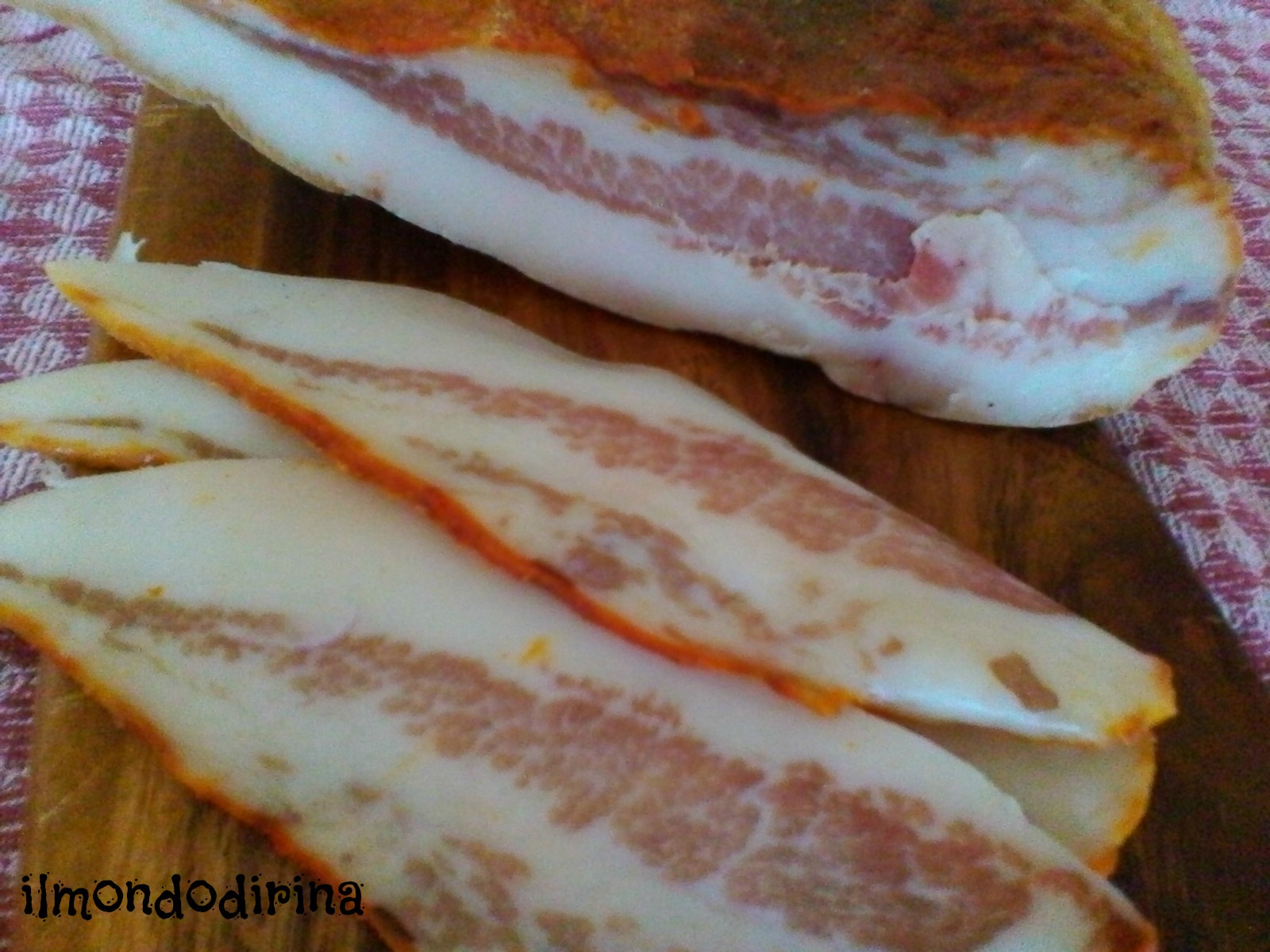 Ritorniamo però a questo appetitosissimo e robusto piatto che avevo voglia di provare, non tanto per i porcini che avevo congelato quanto per assaggiare “u buhjularu ” ormai maturo. Come riportato già qui “u buhjularu” non è altro che un gustoso maiale striato di rosa, di produzione esclusivamente artigianale e ciò non gli permette di avere la denominazione DOP. Di forma tipicamente triangolare, il salume ha un peso che non supera i tre chili e un sapore salato tendente al piccante. Una caratteristica importante è la presenza della cotenna da un lato.