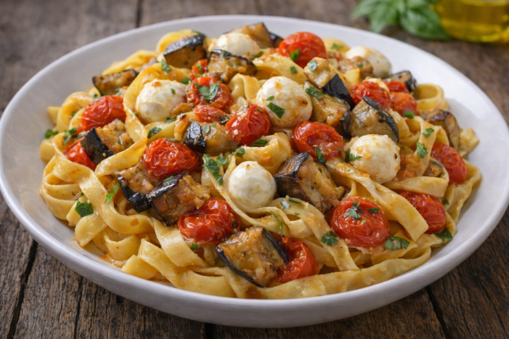 Le tagliatelle con melanzane, pomodorini e mozzarella sono un primo piatto irresistibile che racchiude tutto il sapore della cucina mediterranea: semplice, genuina e ricca di profumi.