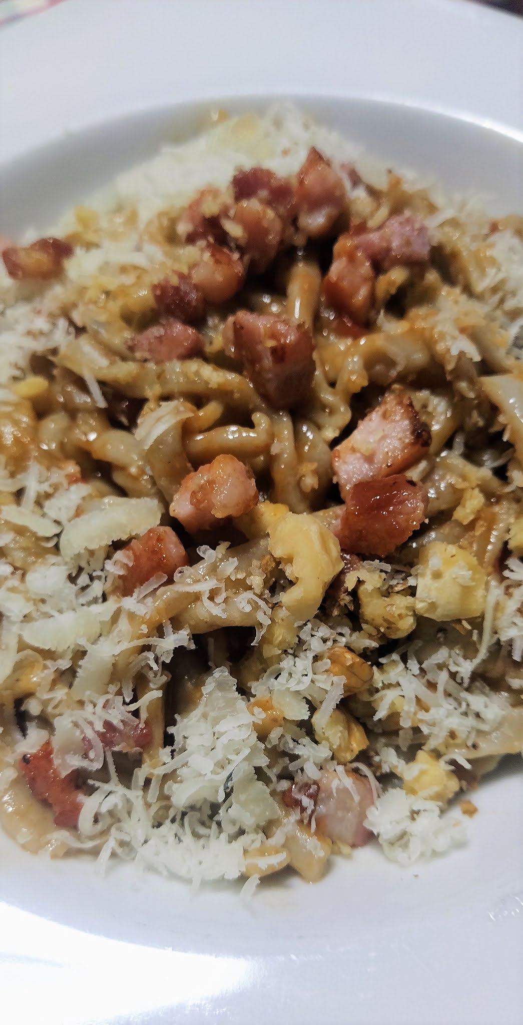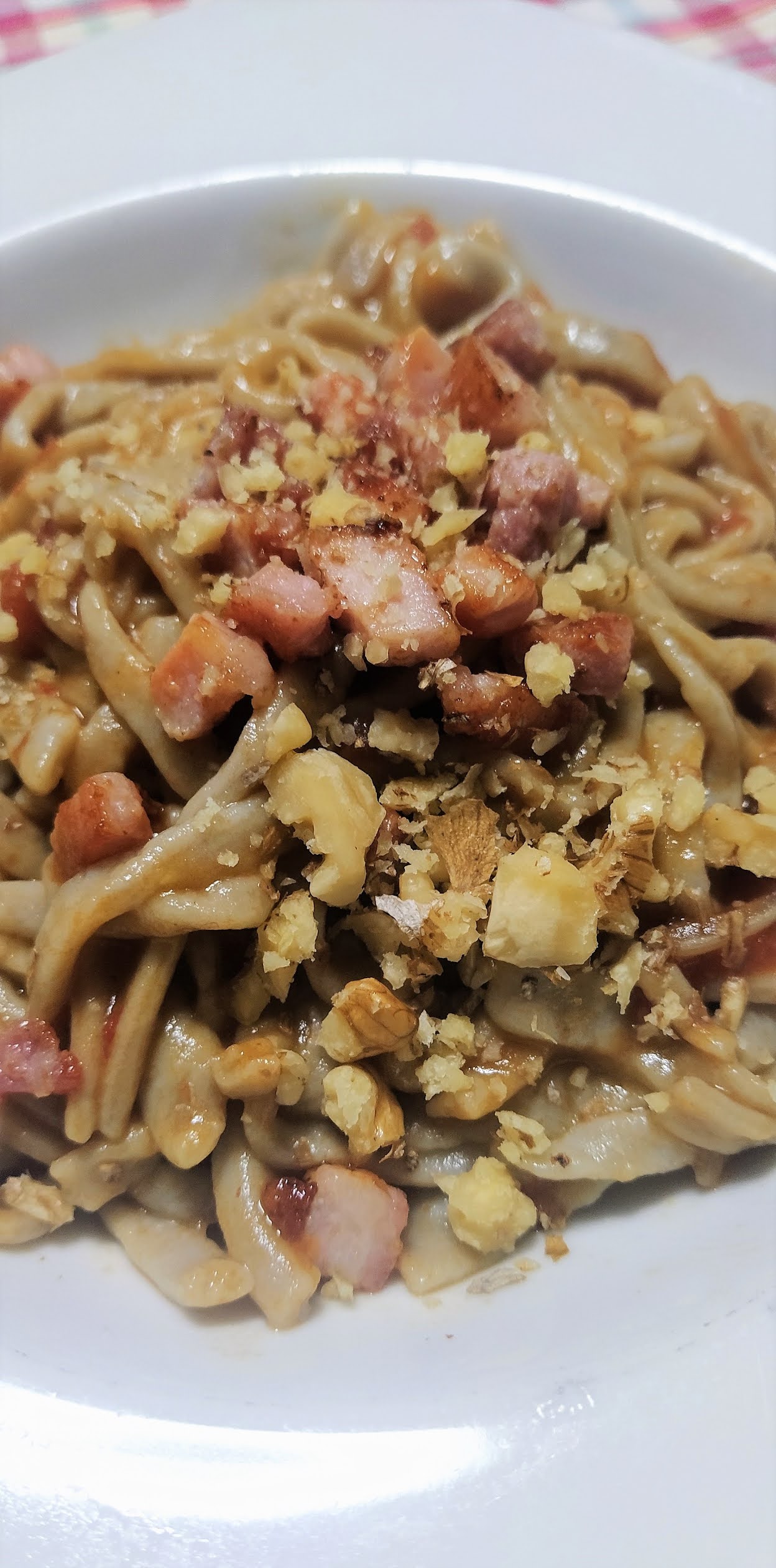 Nel mentre calate le tagliatelle e una volta cotte, trasferitele nella padella col sugo, unite le noci tritate, la pancetta e mantecate.