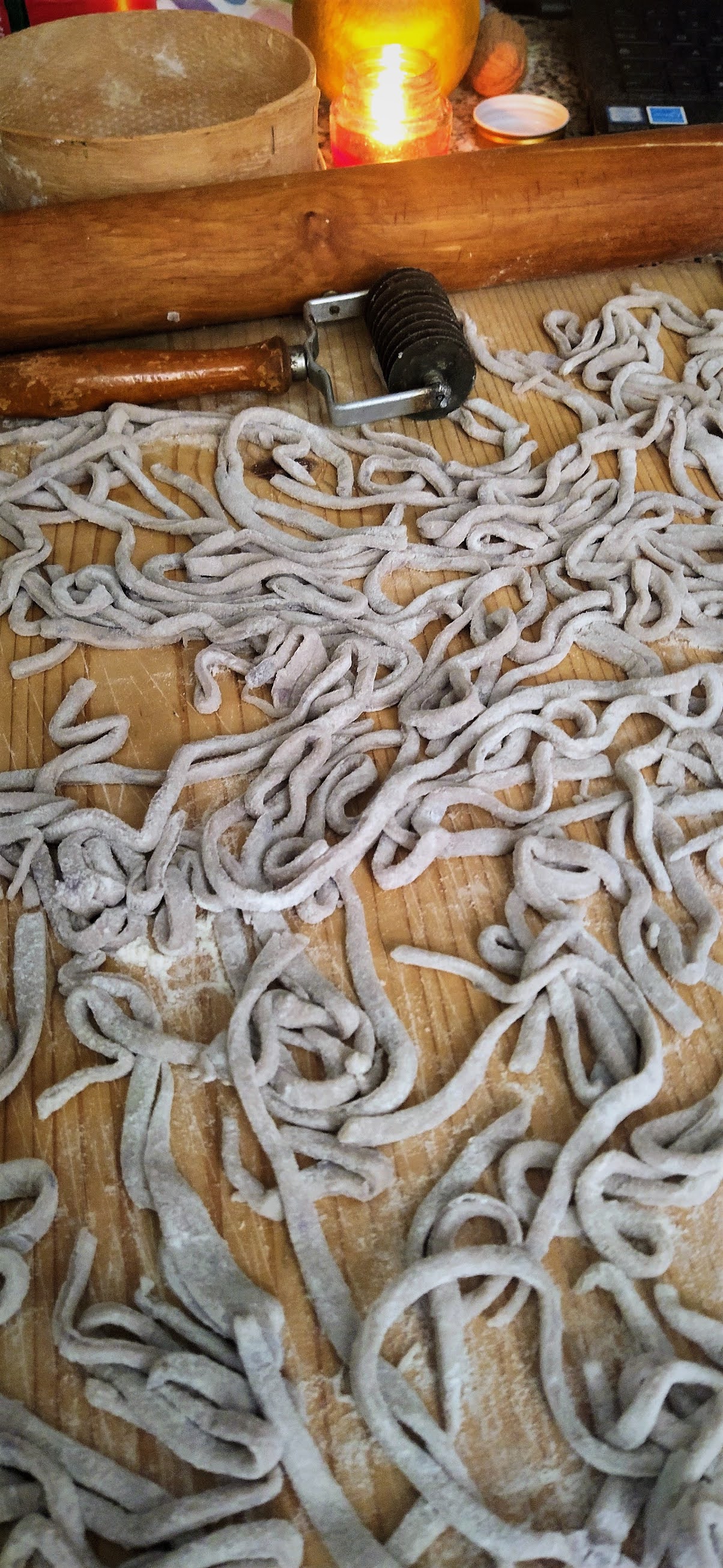 Una volta lavorato e ottenuto il panetto si lascia riposare una mezz’ora al fresco, successivamente sulla spianatoia bene infarinata si tira la sfoglia sottile e si tagliano le tagliatelle.