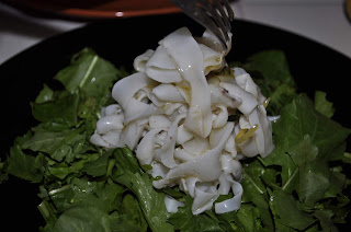 Preparate quindi il piatto mettendo alla base una insalatina di rucola, posizionate al centro le tagliatelle di seppia, sgocciolate dal liquido di marinatura.