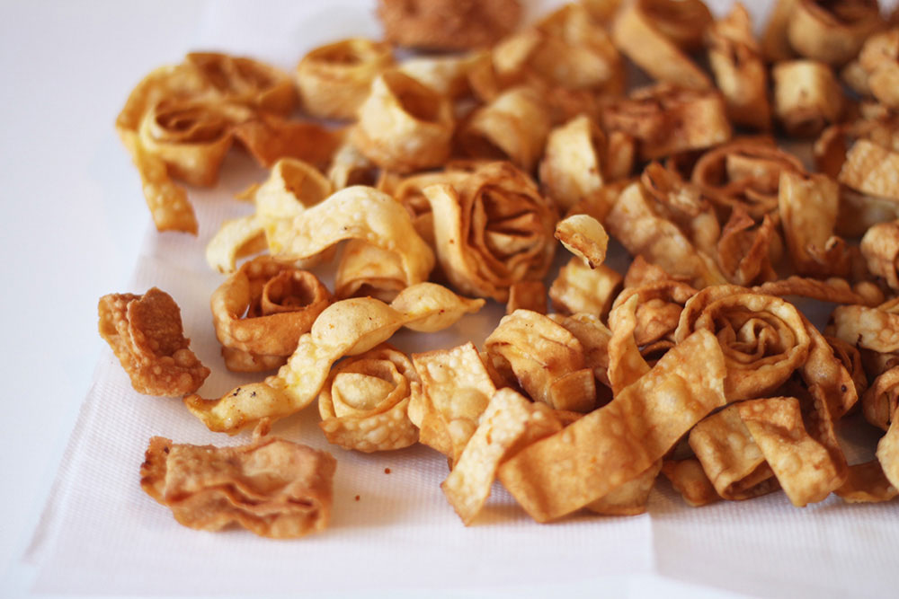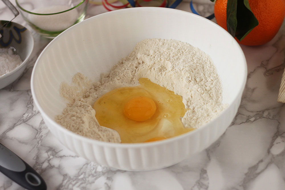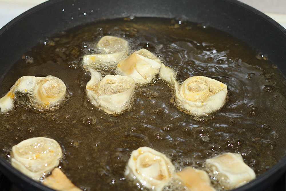 Ecco come si presenta la pasta una volta tagliata: delle piccole “rose” con un delizioso cuore di arancia e zucchero. Portate l’olio a bollore e tuffateci dentro le chiacchiere. Appena la pasta toccherà l’olio, la vedrete gonfiarsi. Non importa se qualcuna si aprirà: quelle “stelle filanti” sono leggere, fragranti e deliziose.