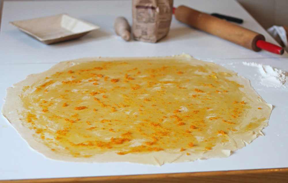 Cospargete di zucchero sulla sfoglia, distribuendolo bene su tutta la superficie, poi arrotolate la pasta su sé stessa, tenendo ogni strato piuttosto largo.