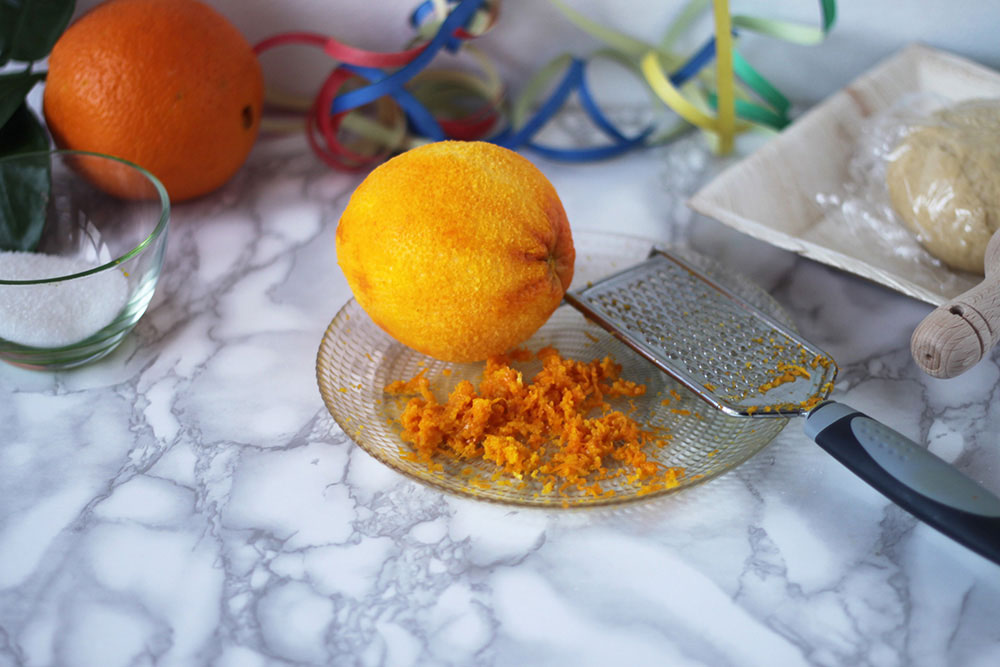 Quando la sfoglia sarà sottile (non eccessivamente sottile però), grattugiate la scorza d’arancia o di limone nello zucchero e mescolate bene.