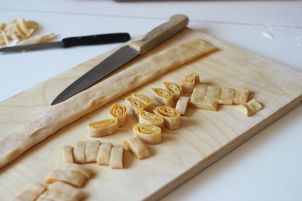 La buona Mirna ci aveva avvisate: 4 cm di larghezza. Noi abbiamo arrotolato più stretto, ma sarebbe stato meglio avere delle “rotelle” più larghe. Imparate dai nostri errori: arrotolate la pasta nella larghezza di almeno 4 cm per ogni piega, quindi tagliate porzioni di 4 cm di larghezza.