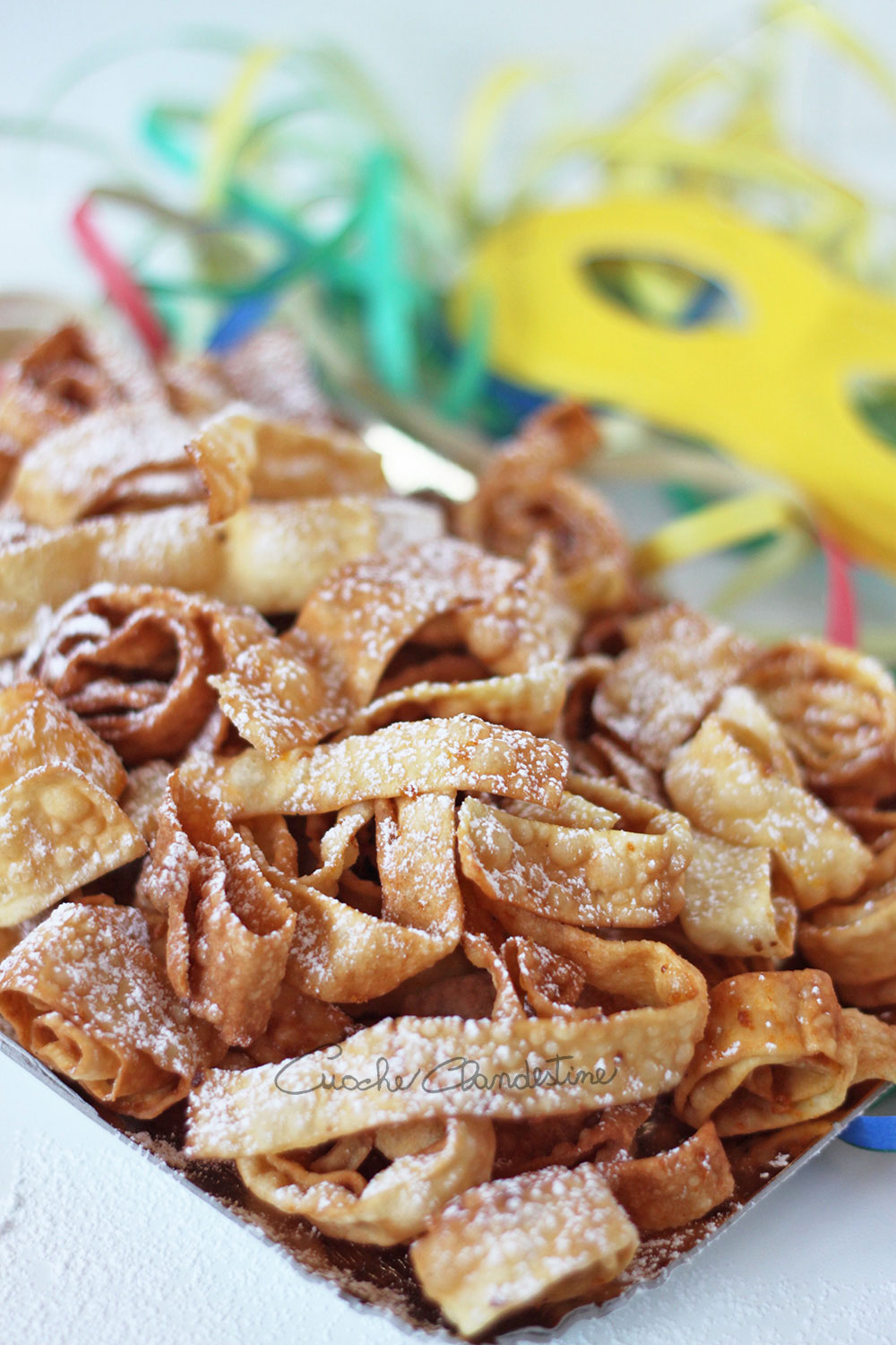 Abbiamo ricevuto il messaggio di una fedele amica del blog, Mirna: “Ciao Cuoche Clandestine, voglio lasciarvi la ricetta delle chiacchiere romagnole (5 uova, 500 g di farina, 100 g di zucchero, 3 limoni) impastare e tirare la sfoglia non troppo sottile. Grattugiare la buccia dei limoni senza arrivare al bianco, aggiungere lo zucchero, mischiare bene e stendere il tutto sulla sfoglia. Arrotolarla e tagliare in rotoli di circa 4 cm, poi friggere, girando le chiacchiere finché avranno un colore appena dorato. Minimo costo, ottimo risultato. Provate e mi direte“.