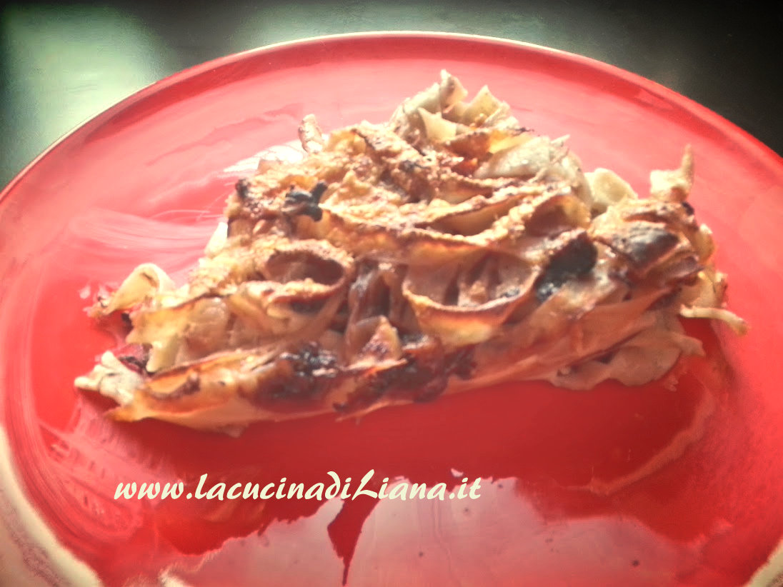 Questa ricetta è nata per caso, avendo preparato uno stufato di radicchio e carote con pancetta tratto dal ricettario Lagostina, ho pensato di usarlo per condire della pasta, arricchendo il gratin dei formaggi che avevo in frigo: mozzarella, groviera ed emmental.