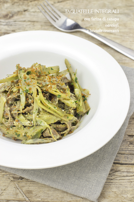 Oggi tagliatelle! però integrali e con farina di canapa, condite con carciofi e briciole croccanti si pane di segale aromatizzato ai capperi. Il condimento è semplice, carciofi saltati, un po’ di aglio, prezzemolo. E le briciole croccanti gli danno un tono leggermente salato aromatico e croccante che rende il piatto u po’ diverso dalle semplici tagliatelle ai carciofi pur restando una preparazione veloce.