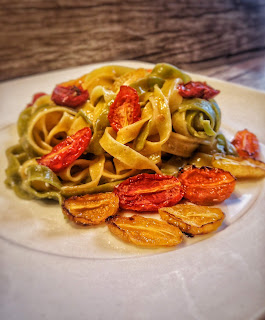 Perché questo abbinamento? Secondo me la pasta all’uovo ben si sposa alla dolcezza dei pomodorini cotti al forno e la nota amarognola del sugo di noci bilancia il tutto.