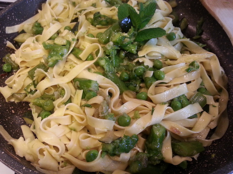 Queste tagliatelle sono un inno alla primavera, riccamente condite con verdure di stagione: asparagi, piselli e zucchine, insaporite in un soffritto di olio e cipollotto e profumate con erbe fresche. Nello stesso tempo sono un piatto abbastanza leggero perché totalmente vegetariano. In altri periodi dell’anno si può preparare con verdure surgelate, ma in questa stagione conviene approfittare di quelle fresche, il risultato è tutta un’altra cosa!