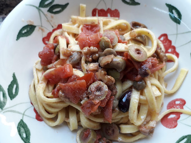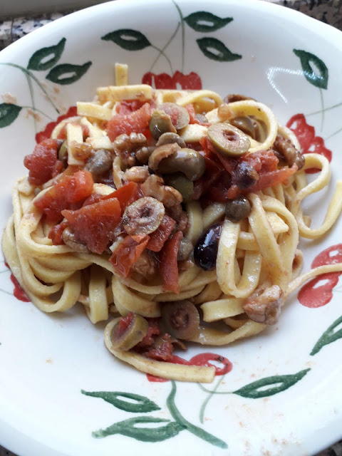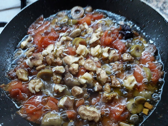 poi uniamo ,peperoncino ,una manciata di funghi tagliuzzati ,le olive a pezzetti,i capperi,i pomodori