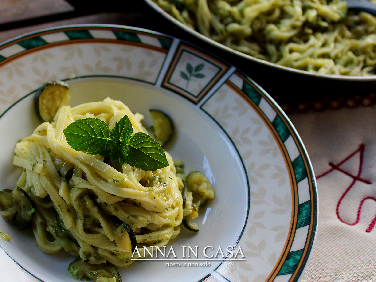 Lessare in acqua bollente salata i tagliolini, scolarli (tenendo da parte 1 bicchiere di acqua di cottura) al dente e versarli nella padella con le zucchine.