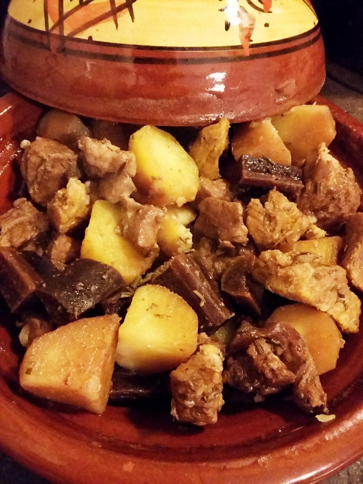 La tajine è una splendida pentola nordafricana in terracotta, dalla caratteristica forma a campana. Ho fatto molta fatica a trovarne una di bella, tradizionale e decorata: quella che vedete viene direttamente dal marocco! In Italia si trovano spesso in ghisa, o in altre leghe metalliche, ma non mi piacciono. La cottura in terracotta regala aromi unici alla carne, e non vedo perché dovrei acquistare la banale brutta copia di un utensile così particolare.