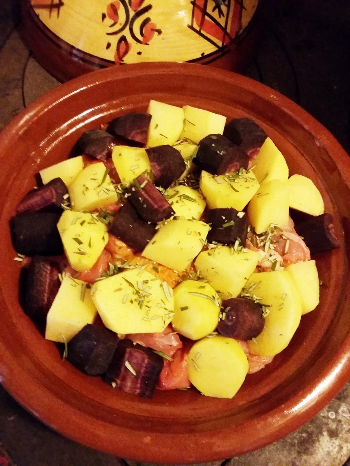 Mescolate lo zafferano nell’olio, versatelo quindi sul piatto della tajine. Versatevi anche l’acqua, che sarà necessaria in cottura, quindi disponete uniformemente la carne. Sopra la carne consiglio di mettere le patate, tagliate a tocchetti regolari, e per ultima la carota visto che cuoce più in fretta. Per ultimo il rosmarino, sopra a tutto.