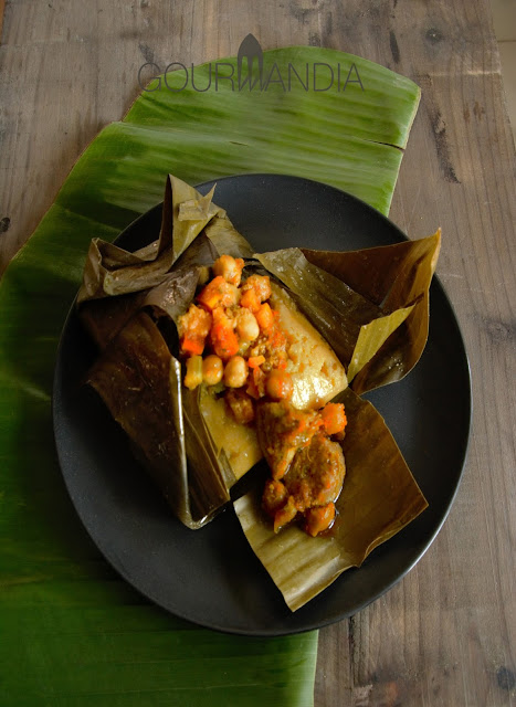 Disponi due rettangoli a croce. Poni al centro, nella zona di intersezione/sovrapposizione delle foglie 3 cucchiaiate di mais, alcuni pezzi di carne di pollo, qualche pezzo di pancetta e salsiccia, mezzo cucchiaio di mirepoix di verdure della marinata e un cucchiaio di ceci. Chiudi i 4 lembi delle foglie sovrapponendoli uno sull’altro, come a formare un pacchetto e fermali con dello spago alimentare. Mettili a cuocere in una vaporiera per 1 ora e ½- 2 ore.