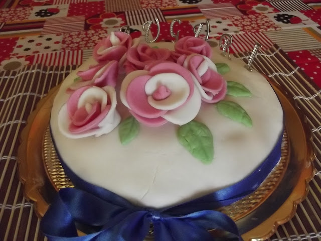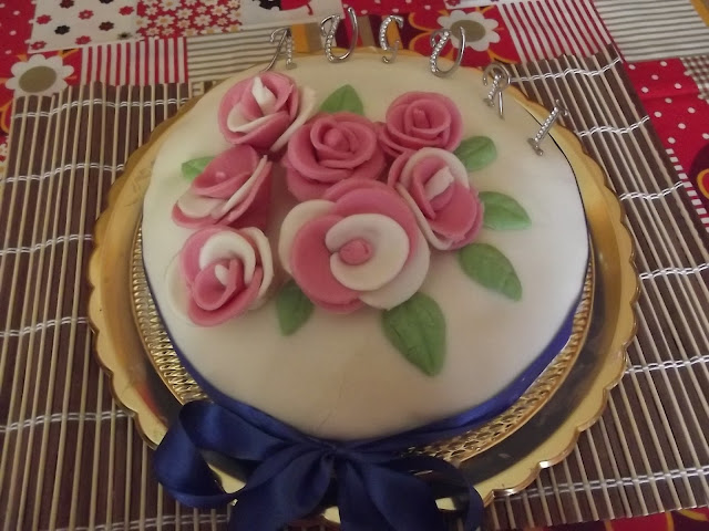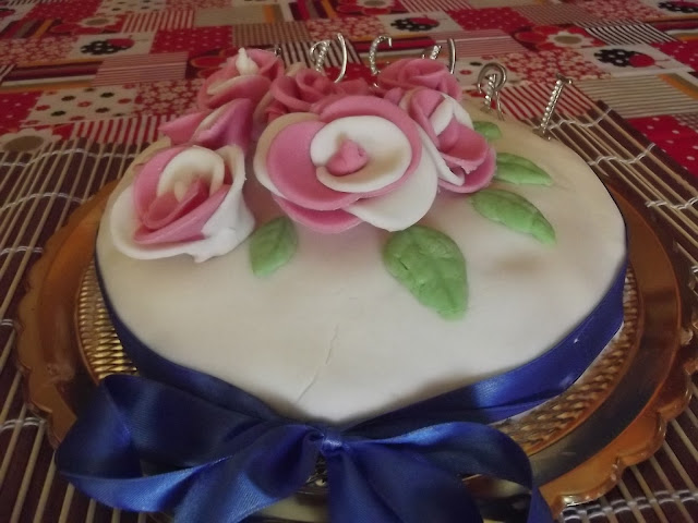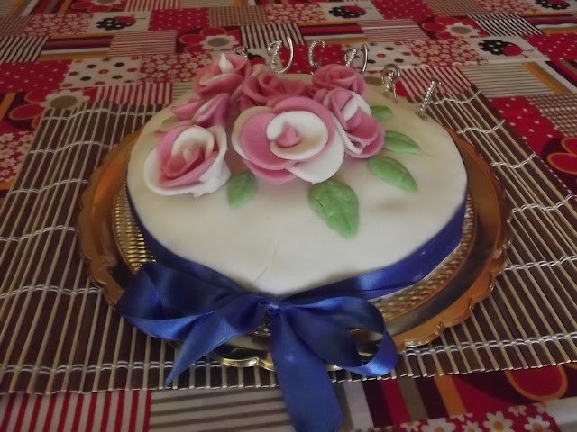 Ho preparato la solita base , l’ho tagliata a meta’, l’ho farcita con una crema all’arancia vista di recente sul web che ho modificato un po’ e di cui vi parlero’ presto presentandola in coppa, l’ho rivestita con pasta di zucchero avorio appoggiata su crema all’arancia distribuita anche sulla torta per fare da collante e poi ho preparato le rose con pasta di zucchero rosa e avorio e le foglie con la pasta di zucchero verde e le ho attaccate con dell’acqua semplicemente.