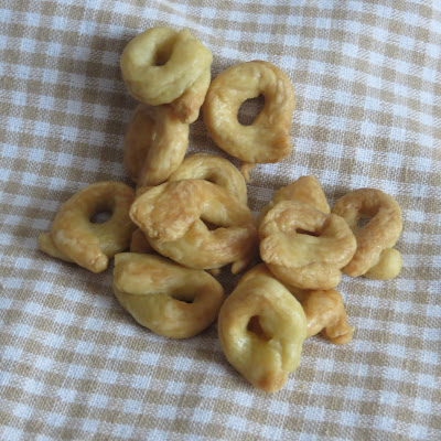 Dividete l’impasto in porzioni e formate dei cordoncini che taglierete con un coltello alla lunghezza di 7-8 cm. Prendete le estremità, unitele e formate un anello.