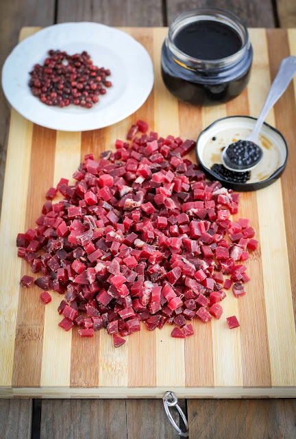 Da piccola odiavo la bresaola. Da adolescente circondata da Madre e Zie spesso a dieta, credevo fosse un “salume tarocco” per far felici le Signore perennemente in conflitto con la bilancia. Ho (ri)scoperto questo prodotto solo dopo esser andata a vivere da sola. Spesso nei primi tempi, dopo il taglio dal cordone ombelicale mangereccio, condita con un filo d’olio e.v.o. la bresaola è stata compagna di cene veloci…il discorso Tartare invece è un po’ più complesso. Da piccola e anche da adolescente, non ho mai sentito pronunciare il termine “Tartare” in casa o in famiglia in generale. In una cucina fatta di estrema tradizione culinaria Campana, non c’è mai stato spazio per nulla “di crudo” – fatta eccezione per le ostriche che assaggiavo una tantum a casa di Zio Gino. Mio Padre poi, convinto estimatore di carne ben cotta, non avrebbe mai concesso che sulla nostra tavola facesse capolino una tartare di bovino crudo. Sono dunque cresciuta a suon di carni dalla cottura (troppo) prolungata ed ho scoperto l’esistenza delle Tartare sulla ventina, quando ciò che portavo in tavola in casa mia, poteva (finalmente) essere solo affar mio…ed il fatto che forse ad oggi non sia riuscita ad innamorarmi della carne cruda è probabilmente legato ai ricordi di infanzia. Mi sono però innamorata del taglio alla Tartare, ed ho iniziato a prepararne di ogni tipo di frutta, verdura, salumi, ho tentato con il tonno fresco – e mi è piaciuta – e con la salsiccia a punta di coltello – divina preparata con il pompelmo rosa!. In questa versione alla Bresaola, ho aromatizzato il tutto con il mio pepe (o bacca) preferito, quello rosa, e dato una nota preziosa con le Perle di Aceto Balsamico dell’Acetaia Giuseppe Giusti.