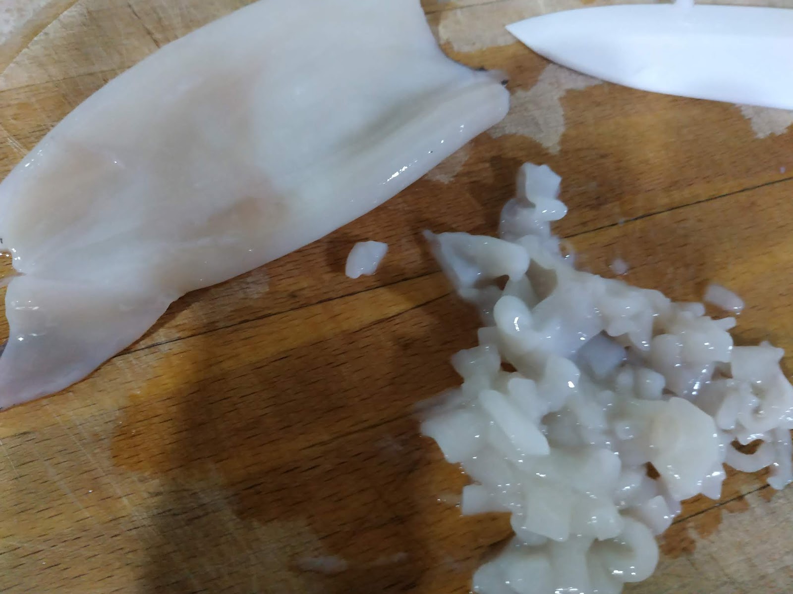 Lavate i calamari puliti, apriteli, togliete la pelle e tagliateli a piccolissimi pezzetti.