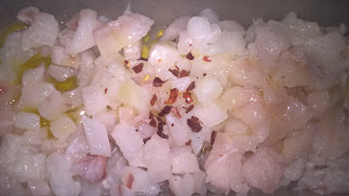 Conditelo con una marinata di succo di limone, olio extravergine d’oliva, foglioline di timo e gli aromi che vi piacciono di più (menta, prezzemolo, aglio…..), peperoncino, sale. Lasciate un paio d’ore.
