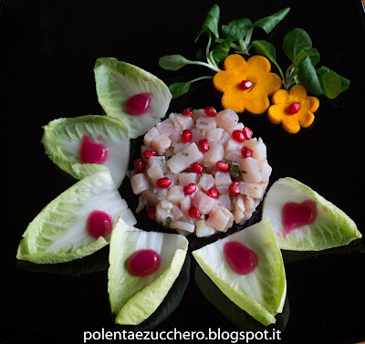 - Impiattare formando la tartare con un coppapasta e disponendo a piacere l’insalata belga, la salsa e i decori di zucca. Rompere la terza melagrana e cospargere alcuni chicchi di melagrano sopra lo spada.