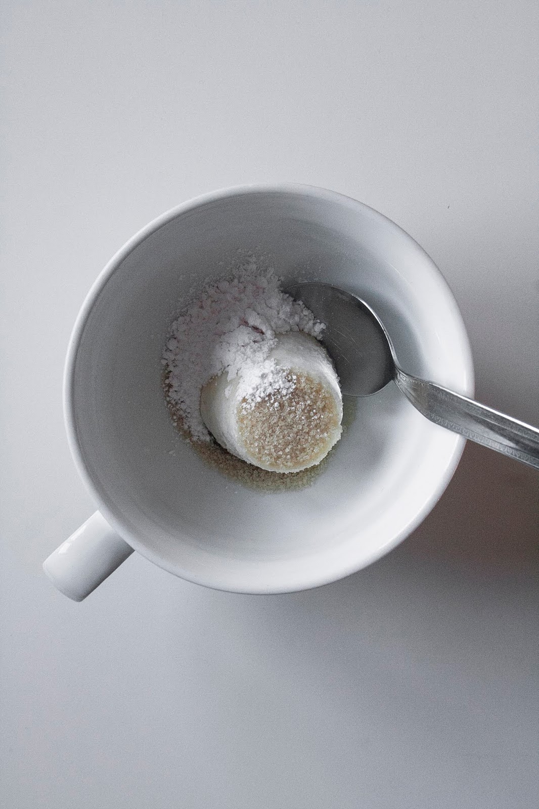 Lavate per bene i mirtilli e irrorateli con 1 cucchiaio di succo di limone e 1 cucchiaio di zucchero di canna.