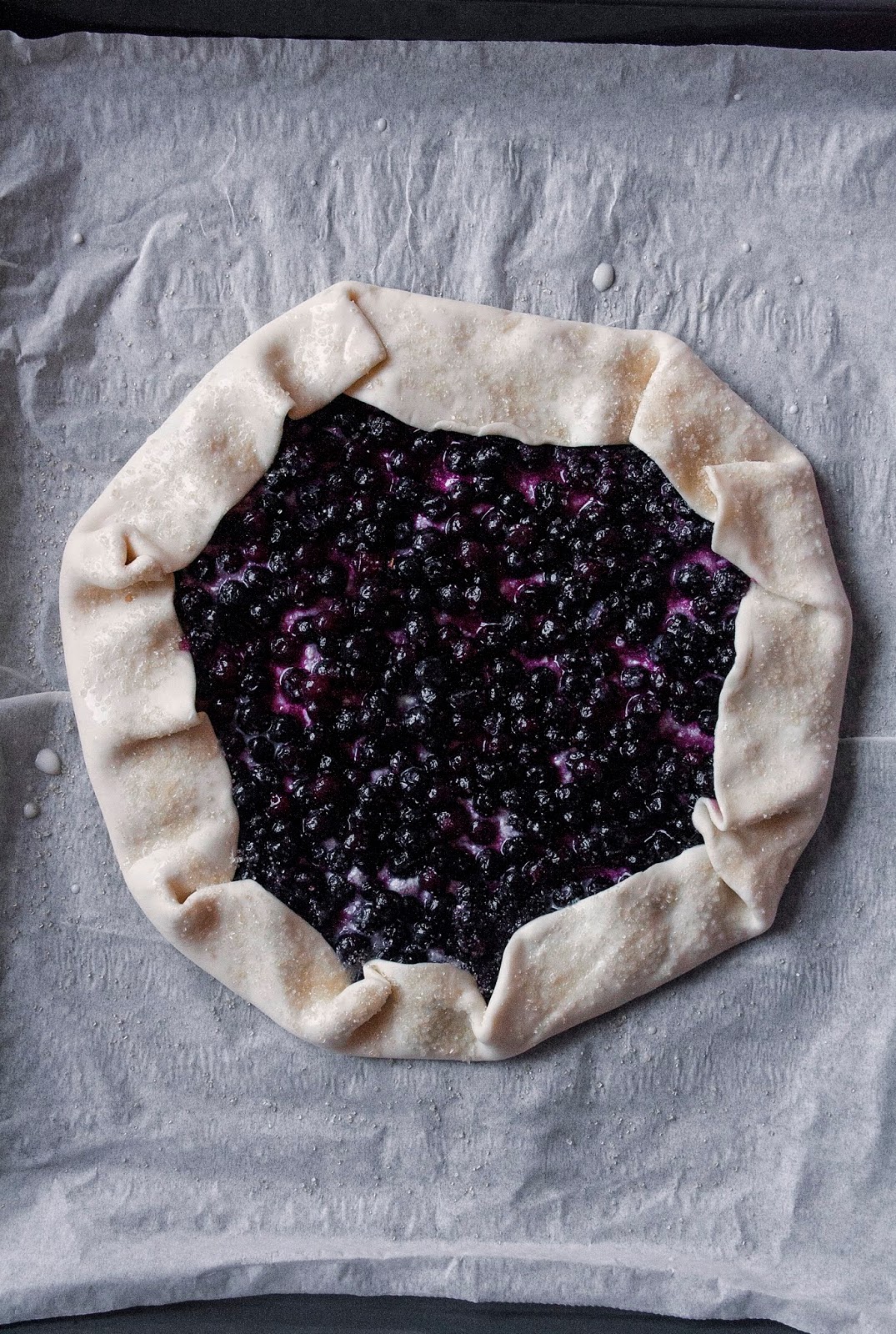 Poi ricoprite la crema spalmata con i mirtilli, ripiegate verso il centro i bordi della pasta, spennellateli con il latte e cospargete il tutto di zucchero a velo.