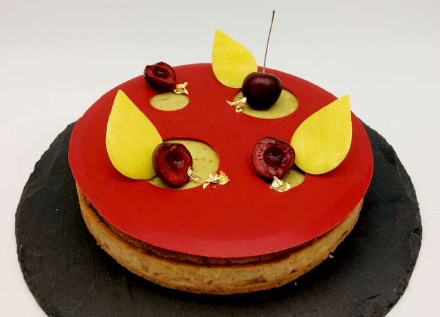 Nell’ultimo numero di Fou de Patisserie, un periodico francese strabiliante, Claire Heitzler dedica una Tarte al connubio fra ciliegie e pistacchio: me sono innamorata a prima vista. Adoro Claire, i suoi dolci trasmettono eleganza e femminilità come pochi altri. E’ stato sufficiente uno sguardo, pochi attimi, per decidere di riprodurla; così ho segnato la pagina aspettando il momento giusto, libero dagli impegni universitari.