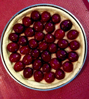 Estrarre il guscio di frolla e adagiarvi sul fondo le ciliegie con la parte convessa verso l’alto ( vedi foto). Versarvi sopra la crema frangipane avendo cura di rimanere 1 mm sotto il margine superiore della frolla. Cuocere a 150°, forno termoventilato, per 20 minuti.