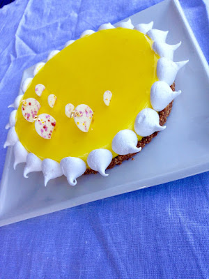 Estrarre il disco di Mousse al limone+amaretto dal congelatore, quindi glassarla ed adagiarla sulla base di crumble ben fredda.