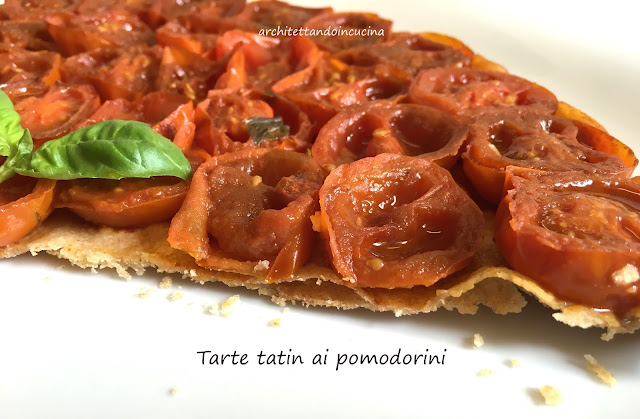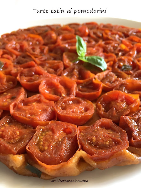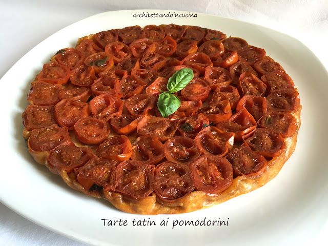 Io ho ho deciso di rifare, la Tarte tatin ai pomodorini di Vittoria Traversa del blog “La cucina piccolina” Perché proprio questa? Perché in questo particolare momento della mia vita, mi rappresenta. La Tarte è una torta che si forma al contrario e solo capovolgendola, mostra la sua vera natura. Io mi sento proprio così: oggi dopo una vita di architettura e design, dopo essere arrivata in alto ed aver fatto cose importanti, aver avuto soddisfazioni e riconoscimenti, tutto questo non mi basta più. Ho voglia di fare altro, di mettermi in gioco. Sarà la crisi di mezza età? Sarà la noia, che ne uccide più della spada? Sarà che ho talmente tante idee in testa che mi sembra di avere vent’anni e tutta la vita davanti? Esattamente non lo so, ma so che non voglio al mattino andare in ufficio come se dovessi partecipare al mio stesso funerale, non voglio più occuparmi e preoccuparmi dei capricci di gente ricca e viziata, solo perché “loro” sono i clienti. Voglio fare cose che mi diano ancora emozioni, gioia, brivido e scoperta. Voglio ancora provare meraviglia, scoprire nuovi orizzonti, nuove mete, nuovi porti e pazienza se a volte sarà faticoso, mi farà male, mi risulterà incomprensibile o penserò: “ma chi me lo ha fatto fare!”. Ho bisogno di sentire che c’è dell’altro, che il gioco non è finito. Per fare questo, ho “ribaltato” la mia vita come una tarte. Ho messo sotto tutto il mio passato ed un po’ del mio presente, li ho accuratamente coperti con un guscio di emozioni, sensazioni, sogni e nuovi obiettivi. Sto aspettando pazientemente che il calore della cottura porti a maturazione il frutto di questo lavoro, e consentirmi, una volta “capovolta” di esprimere al meglio questa nuova fase. So già che ce la farò. Intanto cucino questo torta salata buonissima.